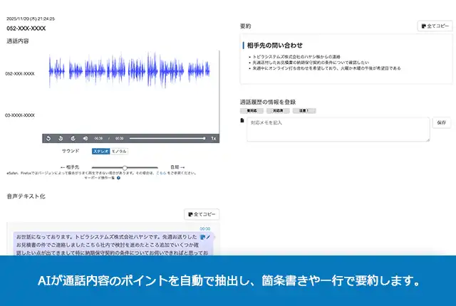 自動録音された通話内容をテキストに変換し、さらに要点を箇条書き一行でまとめます。
