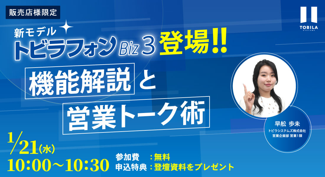 | 【注意事項】: | 本セミナーは、トビラフォン Bizの販売パートナー様限定のイベントとなります。 |