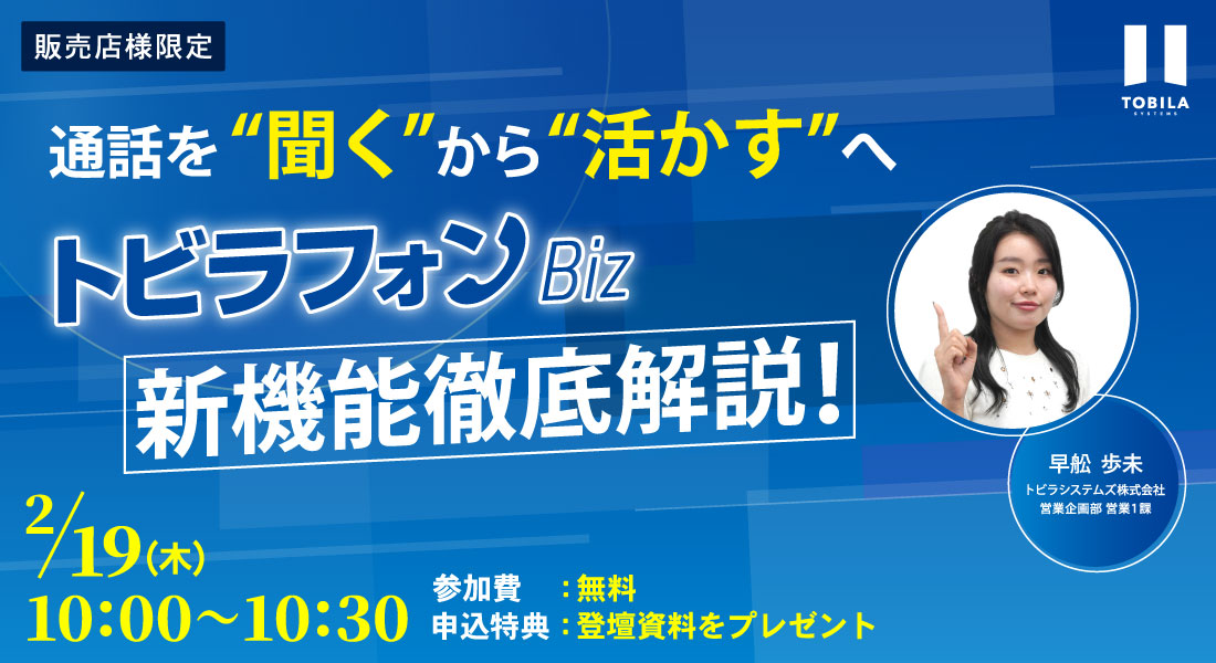 | 【注意事項】: | 本セミナーは、トビラフォン Bizの販売パートナー様限定のイベントとなります。 |
