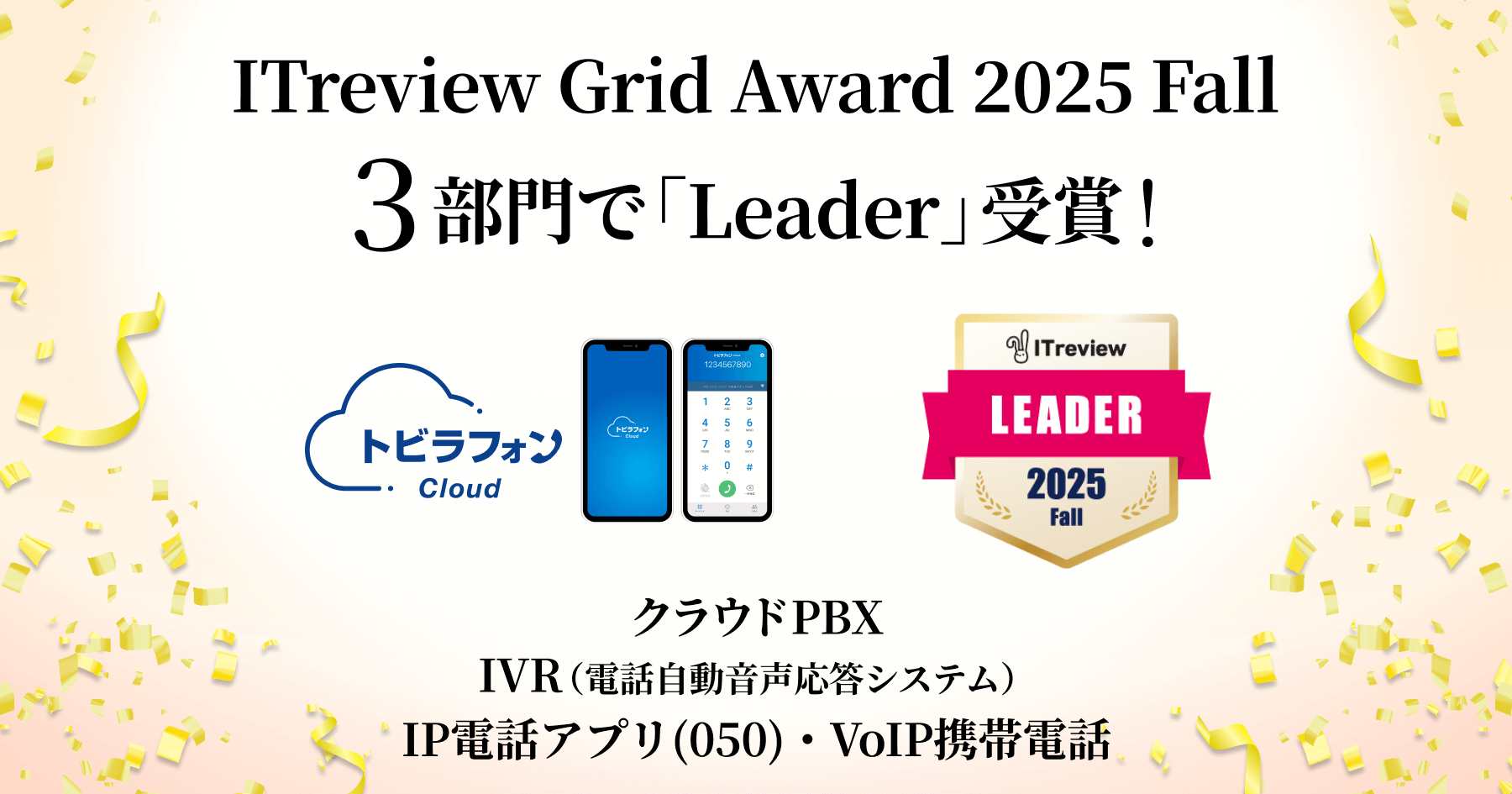 トビラシステムズ株式会社(本社:愛知県名古屋市、代表取締役社長:明田 篤、証券コード:4441、以下「トビラシステムズ」)提供のクラウド型ビジネスフォン「トビラフォン Cloud」が、製品利用者の評価(レビュー)をもとに顧客満足度の高い製品を選定する「ITreview Grid Award 2025 Fall」のクラウドPBX部門、IVR(電話自動音声応答システム)部門、IP電話アプリ(050)・VoIP携帯電話部門の3部門で、最高位の「Leader」を受賞しました。