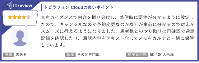 「トビラフォン Cloud」は「ITreview」で平均顧客満足度4.3を獲得しています(2025年10月17日時点 90レビュー)。当製品のご利用者様から実際に寄せられたレビューを一部ご紹介します。